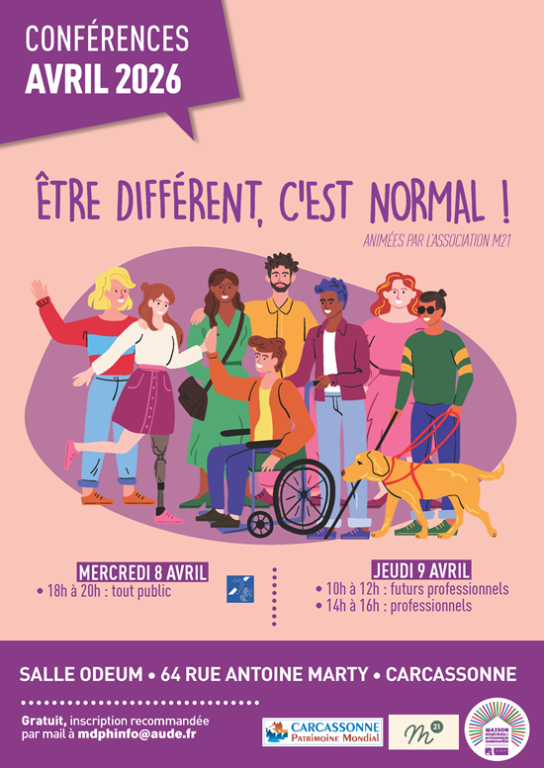 Mots-clés #Handicap Handicap A vos agendas ! Conférences "Être différent c'est normal" La MDPH de l'Aude et l'Association M21 ont le plaisir de vous inviter à la conférence "Être différent, c'est normal". Publié le 23 février 2026 Une conférence interactive de sensibilisation au handicap et à la différence pour :Libérer la parole autour du handicapOser parler de la fragilité et de l'isolementAborder la question de l'annonce du handicap📅 Trois temps de rencontre sont proposésMercredi 8 avril 2026 - de 18H à 20HConférence ouverte au grand public avec la présence d'interprètes en Langue des Signes Française (LSF)Jeudi 9 avril 2026 - de 10H à 12HDestinée aux futurs professionnels, étudiants et lycéens (secteurs médico-social, sanitaire, éducatif...)Jeudi 9 avril 2026 - de 14H à 16HTemps dédié à tous les professionnels📍Lieu : Salle Odéum - 64 avenue Antoine Marty à Carcassonne📩Inscription recommandée : via ce lien Cliquez ici ou par mail mdphinfo@aude.fr.N'hésitez à relayer cette invitation autour de vous ! Préc. Retour à la liste Suivant